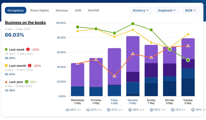 Deze widget geeft inzicht in de huidige reserveringen van het hotel voor de komende zeven dagen. Je kunt de huidige cijfers vergelijken met die van vorige week (groen), vorige maand (geel) en vorig jaar (rood) op hetzelfde moment voor aankomst in het verleden. In de linkerbovenhoek kun je schakelen tussen verschillende KPI’s, zoals bezettingspercentage, bezette kamers, omzet, ADR en RevPAR. Rechtsboven kun je historische gegevens en segmenten in- en uitschakelen. Je kunt ook de vergeleken historische gegevens van Business on the Books naar Actuals schakelen.