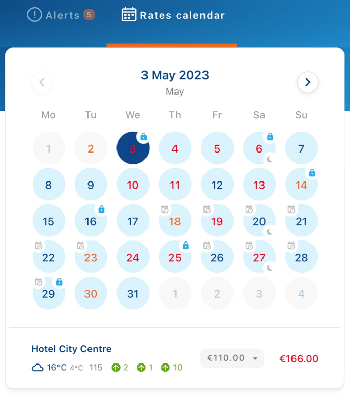 Naast de Alerts wordt een compacte prijskalender weergegeven. Hierin zie je de tarieven en MinLOS-restricties voor de komende maand. Als je op een specifieke dag klikt, worden de tarieven, verschillende KPI’s zoals bezettingspercentage en omzet, en eventueel toegevoegde evenementen weergegeven. Tarieven kunnen hier eenvoudig worden aangepast.