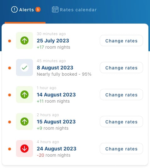 Alerts waarschuwen je voor grote veranderingen in vraag, zoals pickup alerts, of voor ontbrekende instellingen, zoals Minimum rates of Occupancy supplements.